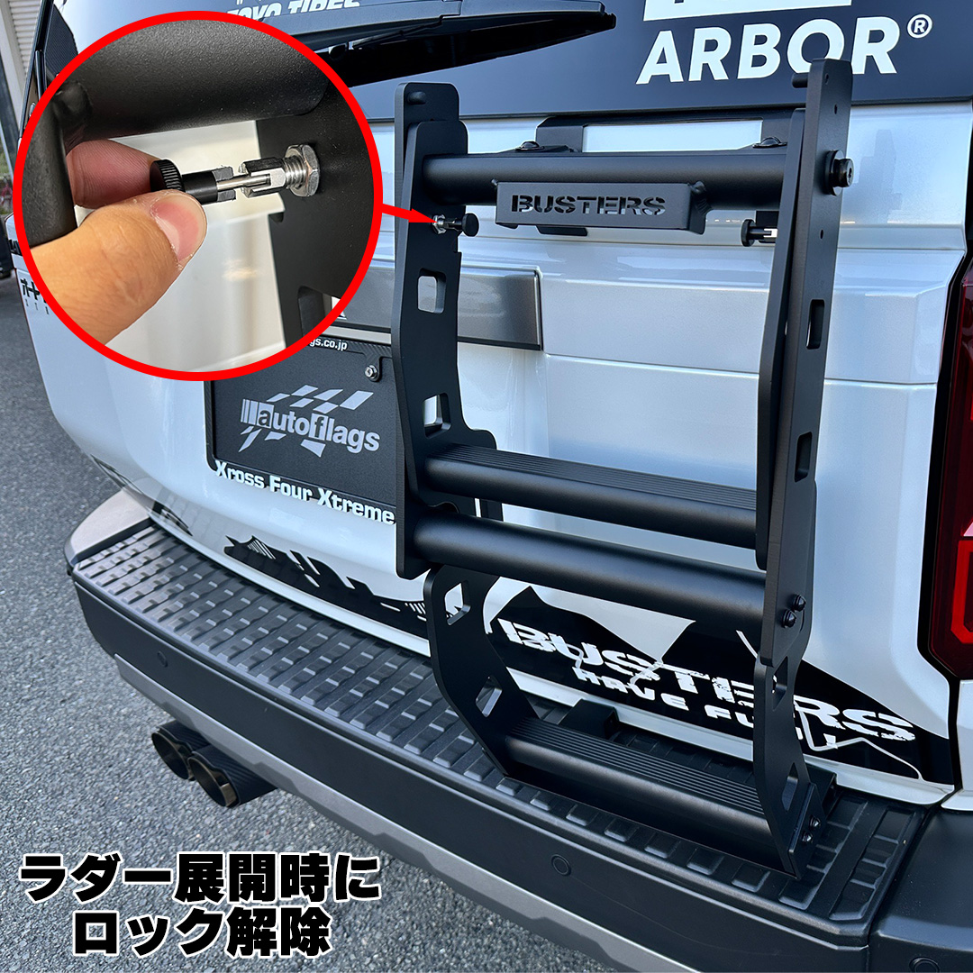 ★ラダー格納時にピンをロックする事で走行中のがたつきを防止します。ロック解除で展開可能に! ![]() |